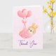 Tarjeta de saludo con un ilustracion adorable. Un pequeño conejito de bebés con una pequeña corona dorada. Llevado por globos en una manta rosa de corazón.