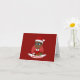 Tarjeta de saludo con el ilustracion de un lindo sonriente niño afroamericano con el pelo negro corto y gafas, el niño está usando un disfraz de Papá Noel con un gorra rojo y sosteniendo un regalo; en un círculo rojo sobre un fondo rojo, un diseño de vacaciones para Navidades con una plantilla de texto editable para tu nombre o mensaje