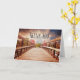 Gracias tarjeta de felicitación con un pintoresco puente de madera que conduce a un camino rodeado de árboles del bosque que cambian de color.