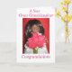 Hermosa muñeca negra sosteniendo flores con el mensaje "Una nueva bisnieta: Felicidades"