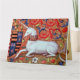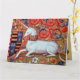 Clásico, elegante flor de lys y motivos heráldicos, floridos remolinos de color azul rojo, flores con un unicornio sentado blanco, elaboración digital de una antigua miniatura medieval.