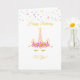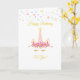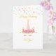 unicornio de cumpleaños, estrellas multicolores, confeti dorado y flores rosadas en tarjeta blanca. Todos los textos se pueden personalizar.