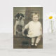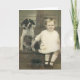 Escriba su propio mensaje en esta tarjeta con un niño joven que se sostiene sobre la pierna del perro de la familia