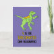 Hágales saber a tus amigos que estás feliz de que estén vacunados con este fuerte dinosaurio. Esta tarjeta de saludo muestra un ilustracion de un velocímetro de verde brillante con un vendaje en el brazo donde recibió su disparo por encima del mensaje "V es para Vacunado (y Velociraptor)" contra un fondo morado. El mensaje interno está listo para el contacto con su personalizado