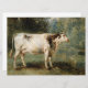 Este diseño incluye un cuadro del artista francés Constant Troyon (1810-1865). Muestra una gran vaca en un paisaje rural. El animal está rodeado de vegetación. La vaca tiene piel blanca con marcas marrones, cuernos pequeños y una cola larga. Esta pintura representa al animal de granja de forma bella y natural.