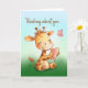 Esta encantadora tarjeta de San Valentín presenta un delicioso ilustracion acuático de una joven jirafa sentada alegremente, sosteniendo un corazón con sus patas delanteras. Cerca hay una simple flauta de mariposa que le da un toque original al diseño. El suave césped verde y el cielo azul claro crean un entorno sereno. La parte frontal dice: "Pensando en ti..." mientras que la parte interior termina con: "... hace sonreír mi corazón. ¡Enviando cálidos deseos y amor en el Día de San Valentín!" Perfecto para compartir afecto sentimental con alguien especial, ya sea un amigo, un familiar o una novia.