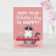 This Valentine's Day card features a gray tabby cat with darker stripes and white fur, facing forward with a big, happy smile. The cat wears oversized heart-shaped sunglasses with dark lenses, giving it a fun, romantic look ❤️. Its paws rest on a bright red, compact electronic keyboard, like it’s about to play a sweet little tune. The background is a soft, muted rosy pink that keeps the focus on the cat and the message. Across the top, the card reads “HOPE YOUR Valentine’s Day IS HAPPY!” in white block-style letters that stand out clearly. Small heart doodles and a little “xo” sit near the wording, adding an extra note of affection 💌🍫. Share some love with this card today.