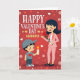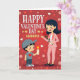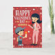 On the front of the card you see a young boy and a smiling woman facing each other on a deep red background that fades in tone. The boy wears a gray cap and a T‑shirt with a bright red heart, and he holds out a small candle with a gentle glow. The woman, dressed in a soft pink outfit, smiles back and offers a single red rose with her hand open in a welcoming way. Around them are scattered hearts in red, pink, and white, along with small pink rose drawings that fill the space like a sweet backdrop. At the top, the card reads “HAPPY VALENTINE’S DAY” in large white letters, and underneath are small gold hearts plus the word “GRANDMA” in smaller gold cursive lettering. It feels meaningful because it shows a simple exchange of care and appreciation, like a hug you can’t always give in person 🥰.