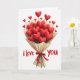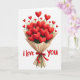 This greeting card shows a bouquet made entirely of red heart shapes, gathered like flowers. The hearts look shiny and slightly puffy, and they rise on thin green stems in the center of the card. A soft cream-colored paper wrap holds the bouquet, with gentle folds that add a little texture. At the bottom of the wrap, a deep red ribbon is tied into a neat bow, matching the hearts and adding a sweet finishing touch ❤️🍫. The background is plain white, so the red hearts and cream wrap stand out clearly. Beneath the bouquet, the words “i love you” appear in red, simple block-style letters near the bottom of the card 💌.