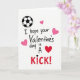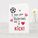 This greeting card pairs a sporty theme with a sweet Valentine’s message on a white background. In the upper left, there’s a classic black-and-white soccer ball that sets the scene right away. Across the center, the text reads, “I hope your Valentine’s day is A KICK!” in a casual, handwritten-style look. Most of the wording is in black, but “KICK!” stands out in bright red, all caps, with an exclamation point. Around the message, several hearts float in different shades of pink, plus one red heart for extra warmth. A tiny black heart is used as a small accent in the lettering, tying the love theme into the sporty pun. It feels friendly, upbeat, and perfect for someone who loves soccer as much as they love a kind note ❤️💌🍫. Hope it helps you share a little extra affection this Valentine’s Day.