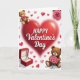 This card features a glowing red heart centered on a bright white background, setting a sweet Valentine’s mood ❤️. Across the heart, the words “HAPPY Valentine’s Day” sit neatly in the middle in a graceful, flowing style, standing out clearly against the red. A teddy bear peeks in from the top-left corner as if shyly joining in, while another teddy bear rests at the bottom-right, holding a small bouquet of pink roses close to its chest 🥰. In the top-right, a single pink rose opens wide with green leaves that add a soft, natural contrast. At the bottom-left, an open red velvet ring box reveals a gold band topped with a sparkling diamond, catching the light like a quiet promise. Small ruby-red and candy-pink hearts drift across the background, giving the scene a light, floating feel. The bears look plush and cuddly, the heart looks glossy, and the ring and diamond glint with tiny highlights against the white space. A gentle, diffused glow surrounds the central heart, while the scattered hearts appear in different sizes across the page.