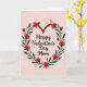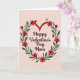 This card shows a soft blush pink background with a heart-shaped wreath of deep green leaves around the center. Scattered through the leaves are small red flowers with lightly outlined petals and darker centers, plus tiny red berries that add extra detail. At the top of the heart sits a shiny red ribbon, folded like a bow where the two sides meet. In the middle, the text reads “Happy Valentine’s Day Mom” in smooth, flowing maroon lettering, placed neatly inside the wreath. The colors feel warm and calm, and the simple heart shape makes the message easy to focus on. It’s a meaningful card to give because it wraps your love and gratitude in a gentle picture that feels caring and close. 🥰❤️