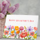 A cheerful Valentine card for a special friend, with “Happy Valentine’s Day” and a row of watercolor wildflowers in pink, purple and orange on a bright white front. On the inside, a small floral cluster and editable text read: “So happy to have you in my life. Happy Valentine’s Day.” A sweet, modern way to make a friend smile and show how much they mean to you. Feel free to change the text to your own message. Enjoy!