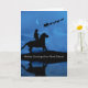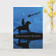 Una tarjeta de vacaciones de Navidad de Dakota del Norte con un vaquero y su caballo mirando mientras Santa y su trineo hacen su ronda en Nochebuena.