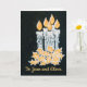 Una tarjeta de Navidad elegante para personalizar en la portada y en el interior, con cinco velas con acebo, pintadas a mano en pintura dorada y plateada sobre un fondo negro estrellado.