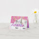 Adorable tarta de unicornio con velas y cubierta de nombres. El fondo rosado dentro con Feliz Cumpleaños para ti y mensaje personalizado! ¡Seguro que cualquier princesa sonríe!