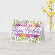 Perfecto para un chica de cumpleaños en julio. Flores de jardín violeta y suave rosa pálido reciben un toque de color amarillo. Las hojas blandas de color verde completan la disposición floral. Feliz Cumpleaños está escrito en un guión en negrita.
