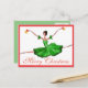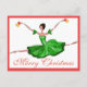 Las bailarinas en un tutú verde del navidad visten feliz el salto. Ella sostiene campanas de navidad en sus manos con los arcos rojos. Saludo del navidad para los amantes del ballet.
