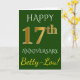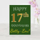 Este diseño de tarjeta de felicitación simple y personalizada para aniversario de bodas presenta el mensaje "FELIZ 17º ANIVERSARIO", con el "17º" teniendo una apariencia similar al oro. La parte delantera también presenta un nombre personalizado y un fondo verde. El interior presenta un mensaje de felicitación personalizado para el aniversario de bodas. Se podría dar a un esposo o una esposa en celebración del decimoséptimo aniversario de bodas de la pareja. [~Z0000086]