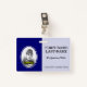 Este sencillo y básico diseño de insignias incluye una imagen de retrato de personal de personalizable o empleado, junto con un nombre personalizado y un título de trabajo. Las insignias como estas podrían ser usadas por los empleados de un negocio.