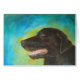 Retrato mascota de un labrador negro de perfil contra un fondo azul.