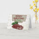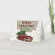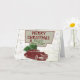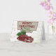 Una tarjeta de Navidad de estilo vintage que tiene un auto clásico que transporta un árbol de Navidad en la parte superior con un mapa detrás. Esta tarjeta de felicitación de viaje de vacaciones al estilo retro será una tarjeta divertida para enviar esta temporada navideña.