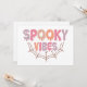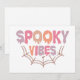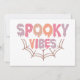 Este divertido y festivo diseño de Halloween presenta la frase "Spooky Vibes" en una fuente juguetona y goteante que le da al texto un efecto viscoso y espeluznante. Las palabras están llenas de tonos pastel suaves de rosa, naranja, púrpura y melocotón, lo que agrega un giro ligero y caprichoso al tema espeluznante. Debajo del texto, una simple ilustración de una telaraña en un color marrón suave agrega un toque clásico de Halloween, uniendo el diseño. La combinación de los colores pastel y los elementos espeluznantes crea un contraste único que es a la vez lindo y un poco espeluznante, lo que lo hace perfecto para Halloween.