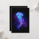 Large, blue, artistically drawn, glowing, bright jellyfish, with long tentacles on black background with purple bioluminescence. Luminous jellyfish.
