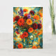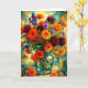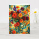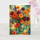This greeting card features a radiant bouquet of dahlias and wildflowers displayed in a glass vase, rendered in a bold geometric and abstract style. Rich oranges, reds, yellows, and purples contrast beautifully against a mosaic-inspired background, creating a joyful and artistic composition. Perfect for birthdays, celebrations, thank-you notes, or any occasion that calls for color, warmth, and creative elegance.