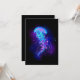 Gran medusa azul, de dibujo artístico, brillante y brillante, con largos tentáculos sobre fondo negro con bioluminiscencia violeta. Luminosas medusas.