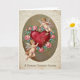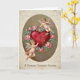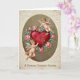 This Valentine's Day card shows a large red heart in the middle, set inside an oval frame. Around the heart is a ring of light pink roses and small blue forget-me-nots with green leaves. Two small Cupid angels hover nearby, both with rosy cheeks, golden curls, and pale, shiny wings. The Cupid near the top is flying and has just shot a gold arrow straight into the heart, with tiny gold specks falling from the spot where it hits. The lower Cupid leans in with an open, gentle look, as if reaching toward the heart and flowers. Behind them, the oval background is a muted olive color with a worn, cracked texture, and the outer border is cream with raised swirls and flower details. The words “A Victorian Valentine’s Greeting” appear on the card in a flowing, dark style near the bottom, adding a sweet, old-time feel 💘❤️.