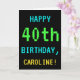Este sencillo y divertido diseño de tarjetas de felicitación de cumpleaños incluye un mensaje como "¡FELIZ CUMPLEAÑOS, CAROLINE!". También presenta un aspecto divertido y pixelado que recuerda a la aparición de los clásicos juegos de computadoras de la era de los 8 bits de los años 80 y principios de los 90. El nombre en la parte delantera y el mensaje en la parte interior se pueden personalizar. Se podría mandar o dar a alguien que esté celebrando su cuadragésimo cumpleaños, y que disfrute jugando videojuegos de época. [~Z0000099]