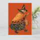 Un encantador ilustracion vintage de una vieja bruja, con un chal naranja con gatos negros y diseños de búho impresos en él, y estrellas y vestido de luna. Está sosteniendo una linterna de gato y usando un gorra de brujas. Ella tiene el pelo blanco y una nariz grande. Muy encantador. Ideal para los que aman ilustraciones de viejas brujas y el vintage arte de Halloween.