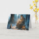 Un anciano vestido cálidamente se sienta en un tronco en un bosque nevado con un conejo sosteniendo un cono de pino brillante que se parece a un pequeño árbol de Navidad. Se puede cambiar el texto.