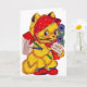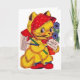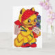 Una imagen de la tarjeta de felicitación del vintage ofrece un gato amarillo lindo en zapatos rojos y un capo rojo. Ella tiene un rastrillo y una pala sobre su hombro y un pote de flores en un brazo con una etiqueta del regalo que diga "a mi tía para el día de madre." El mensaje dentro de la tarjeta está "con un corazón lleno de deseos por un día por completo de felicidad."