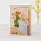 Una imagen vintage de la tarjeta de cumpleaños con una joven ventana de compras frente a una tienda de panadería con pasteles decorados. Parece que se ha instalado en una torta de capa rosa. La parte delantera de la tarjeta dice "Feliz cumpleaños" y el mensaje dentro de la tarjeta es: "¡Toma la torta!"