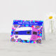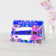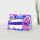 Carné de feliz cumpleaños del remolque de camper vintage. El camper dulce es blanco, azul oscuro y rosa. Hay una señal de paz en la parte delantera del acampador y un corazón en el lateral. El camper flota sobre un fondo de flores modas, azul intenso, azul oscuro, rosa, rojo, amarillo y blanco. La parte delantera de la tarjeta tiene una plantilla que dice "feliz nombre de cumpleaños". El saludo interno dice "te envía sonrisas por cada momento de tu día especial. ¡Feliz cumpleaños! Tu amigo, nombre".
