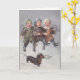 Una ilustración vintage de tres niños marchando a través de la nieve uno al lado del otro en un día de invierno, con los brazos entrelazados. Cantan una canción mientras cae la nieve. Un perro Dachshund de mascota está justo delante de ellos llevando una rama de acebo en la boca. El mensaje dentro de la tarjeta es: "Que la Navidad brille con momentos de amor, risa y buena voluntad."