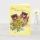 Una imagen de la tarjeta de felicitación del vintage ofrece dos gatitos lindos que han volcado una cesta por completo de flores amarillas y blancas. ¡El frente de la tarjeta dice, "hola! Cómo está usted hoy?" El mensaje dentro de la tarjeta "apenas está pensando en usted y cayendo una línea para esperarle esté bien y ese todo está muy bien."