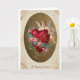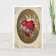 This design shows a vintage-style Cupid resting on a deep red heart, looking outward with a sweet, knowing expression 🥰. The Cupid has soft golden curls and pale pastel wings, and his relaxed pose makes the scene feel gentle and affectionate. The heart is covered with flowers, including light pink roses, small blue forget-me-nots, and trailing green ivy. A gold arrow runs through the heart, and tiny gold specks seem to scatter across the aged, crackled gold background. Around the scene is a creamy border with raised, curling details, plus light sepia marks that make it feel old and well kept. There isn’t any readable text on the front, so the picture does the talking and leaves room for your own words inside ❤️. It feels meaningful to give because it nods to classic romance and reminds someone they’re cared for in a simple, lasting way.