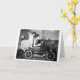 Una fotografía vintage de tres mujeres apiladas en un minúsculo auto en medio de una sala de estar. El verso dice: "¡Los tiempos locos llaman a los amigos locos!"
