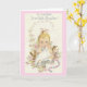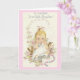 Una imagen vintage de una tarjeta de saludo muestra a una adorable bebé con un vestido blanco, su pelo rubio jalado con una cinta rosa. Se sienta en medio de un rastro de rosas rosas rosas, una jirafa rellena y conejo, y perlas rosadas y azules. La parte delantera de la tarjeta dice "Para dar la bienvenida a tu pequeña hija" y el mensaje dentro de la tarjeta es "debes ser tachado de rosa con la adición de tu chica de recién nacido".
