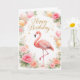 An elegant and joyful birthday card design featuring a graceful pink flamingo framed by a lush floral wreath. Soft watercolor roses, peonies, and greenery intertwine with pastel balloons and delicate gold accents, creating a light, airy composition. The refined gold script “Happy Birthday” adds a touch of sophistication, while the flamingo’s poised stance brings charm and personality.