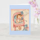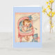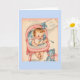 Una imagen vintage de una tarjeta de saludo muestra a un bebé sonriente sentado en una silla alta y tirando una cuchara. Un gato animal relleno está sentado en el suelo a los pies del bebé. La parte delantera de la tarjeta dice "Un regalo para el bebé" y el mensaje dentro de la tarjeta es "¡Estoy muy emocionado de brindarle a usted y a su bebé amor hoy!"