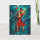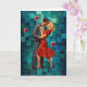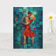 A couple shares an intimate kiss against a geometric blue-green background. The woman wears a red dress, creating a striking contrast.