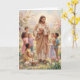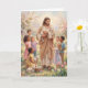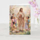 Celebrate the warmth of Easter with this joyful card featuring a pastel painting of a smiling Jesus standing in a lush green field, tenderly holding a lamb in his arms while a group of happy children surround him with radiant smiles. Gentle lambs graze nearby in the soft grass beside a basket overflowing with colorful Easter eggs, evoking the pure delight of new life and unconditional love. Inside, the message expresses deep gratitude for the risen Savior who journeys with us daily, offering a personal blessing of love and celebration. This card beautifully shares the tender hope and everyday presence of Christ’s resurrection.
