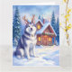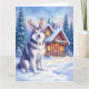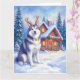 Celebrate the holidays with this adorable watercolor Christmas card featuring a fluffy Alaskan Malamute wearing playful reindeer antlers. Set beside a snowy cabin glowing with colorful lights, this cozy winter scene brings seasonal charm to every mailbox. Ideal for dog lovers, pet parents, and breed enthusiasts, this card’s blank interior makes it easy to personalize with heartfelt holiday greetings. A warm and cheerful way to share festive spirit.
