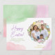 Personalizable Easter card design featuring Destei’s watercolor willow wreath with pastel Easter eggs, framing a custom family photo. The background is white with watercolor splashes in green, pink and lavender purple at the edges. “Happy Easter!” appears in purple next to the wreath with space below for a personal Easter message in green. Beneath the wreath is a personalizable area for a name and year in yellow. The back continues the watercolor splash theme creating a cohesive, colorful and pastel design. A bright and colorful way to send personalized Easter greetings.