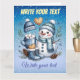 Charming winter illustration with a smiling snowman, striped scarf, blue mug of cocoa, boots and pine accents. Soft blue palette, warm accents, and cozy season feel!