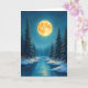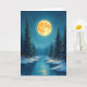 This beautiful picture shows a snowy winter night with a big shiny moon 🌕 and sparkly stars in the dark blue sky. On the sides, there are tall pine trees covered in snow, framing a calm river below. The whole scene feels magical and quiet, with warm amber colors blending with icy blues.